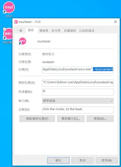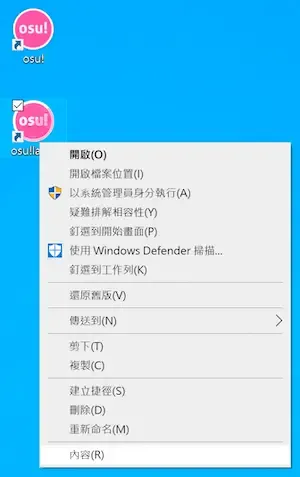 - 在桌面的 osu!lazer 捷徑上按右鍵,點「內容」