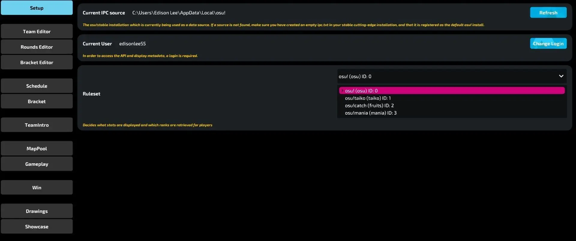 須先設定,可參照 osu! 官方文件: https://osu.ppy.sh/help/wiki/Tournament_Drawings