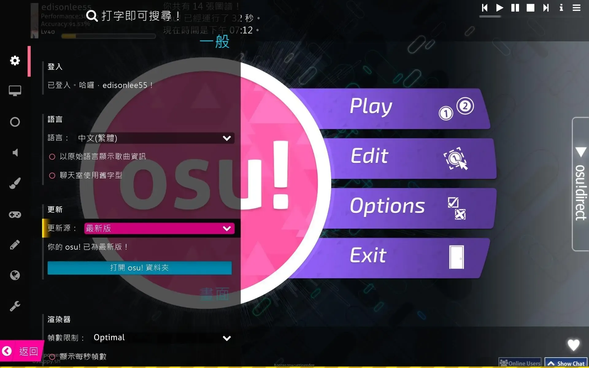 - osu! 帳號登入 (如果還沒登入請按 Change Login 登入,需要 osu! 帳號才能正確獲得圖譜等資料)