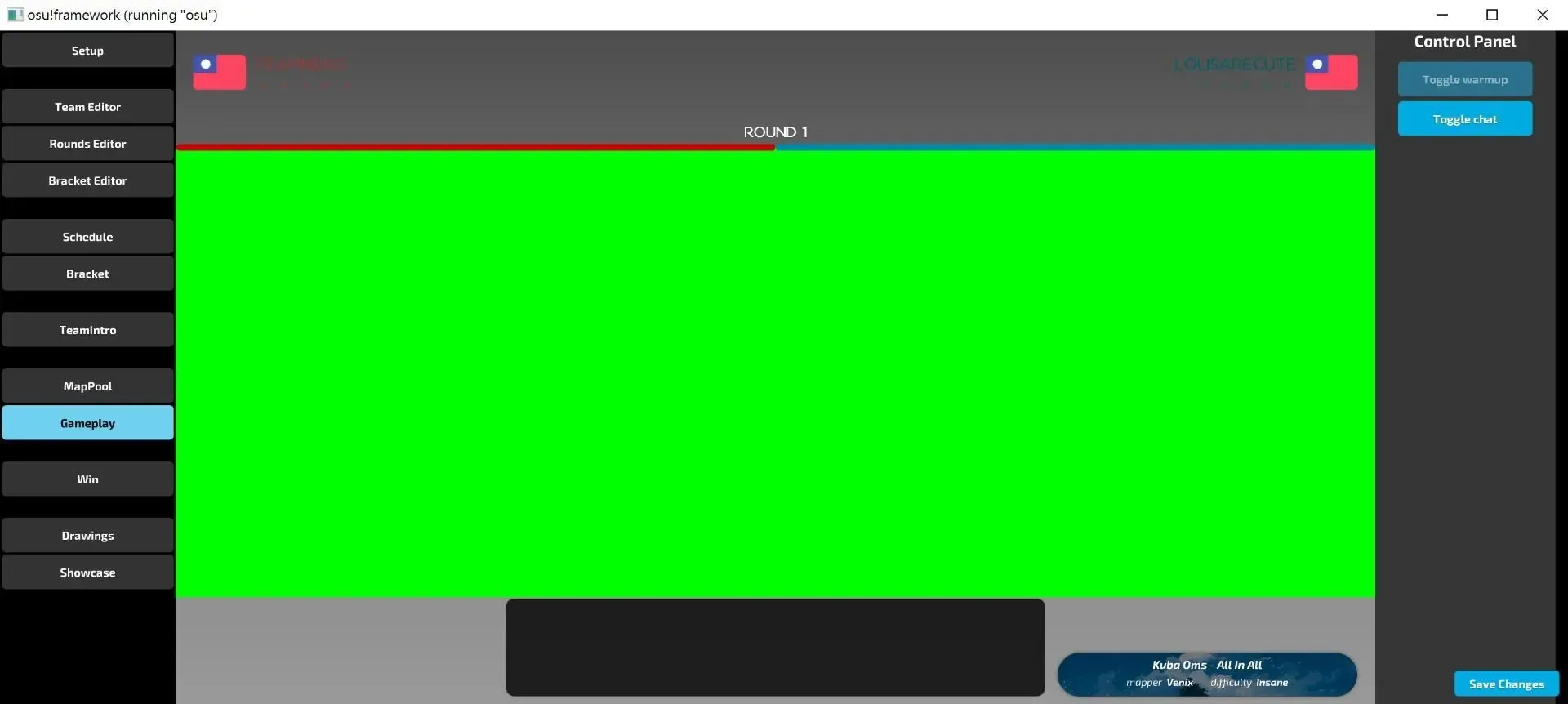 以 IPC 和 osu!tourney 即時同步分數和目前圖譜,擁有綠布幕可將本介面和 osu!tourney 的畫面合成到 OBS 直播中,下面同時同步比賽房間聊天室內容。