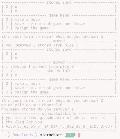 Flag: AIS3{5._e3_b5_6._a4_Bb4_7._Bd2_a5_8._axb5_Bxc3}